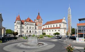 Feldbach - Zentrum mit Villa Hold und Kirche.JPG