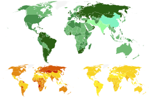 Male–Female ratios of suicide rates in 2015. Data by World Health Organization (rev. April 2017): global average 1.7 : 1 is used as a reference (men were 70% more likely than women to die by suicide). Below, male (left) and female (right) age-standardizedα suicide mortality rates per 100,000 individuals used to derive the above ratios. (الإنجليزية)