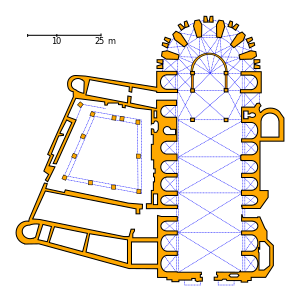 Severní fasáda: vlevo patrný nižší podkovovitý závěr s [[fiála]]mi [[pilíř|opěrných pilířů]], více vpravo přiléhá těsně k lodi jen o málo vyšší románská věž s dvojicemi podvojných oken v každém podlaží, patrné jsou rovněž mohutné opěrné pilíře lodi (التشيكية)