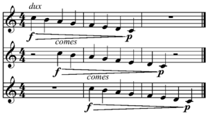 contrapuntal form of music involving a self-harmonizing theme with imitations offset in time |