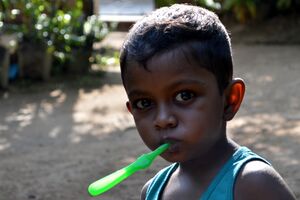 A student at Le Pelican School brushes her teeth following lunch. (4511288052).jpg