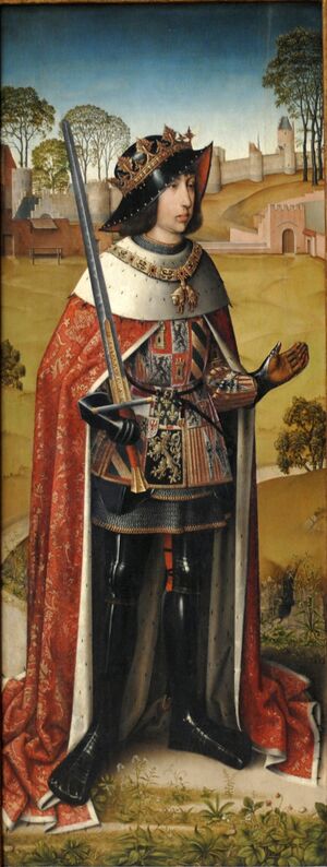 | الإنجليزية | Zierikzee Triptych left flap. Avers: Philip the Fair; Reverse: Saint Liévin |