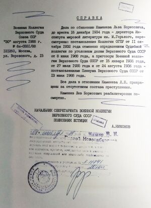 certificate of rehabilitation of Lev Kamenev, who had been executed as part of the Great Purge under Stalin in 1936 (الإنجليزية)