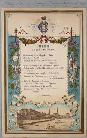 Menükarte für den 29. September 1884 im „Königl. Belvedère“ in Dresden aus der Sammlung Sahrer von Sahr (SLUB/Deutsche Fotothek via Wikimedia Commons, gemeinfrei) (الألمانية)