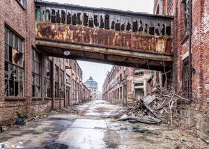 Fabrikanlange von Bleichert & Co. im ruinösen Zustand, 2008 (Wikimedia Commons/Freddo213, Lizenz: CC BY-SA 4.0) (الألمانية)