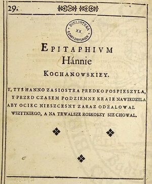 Pierwodruk "Epitafium Hannie Kochanowskiej" w drugim wydaniu "Trenów" z 1583 (البولندية)