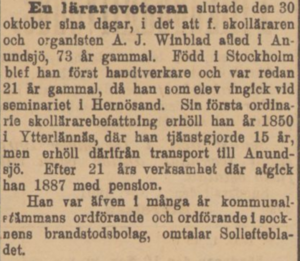 En lärareveteran slutade den 30 oktober sina dagar, i det att f. skollånaren och organisten A. J. Winblad afled i Anundsjö, 73 år gammal. (السويدية)