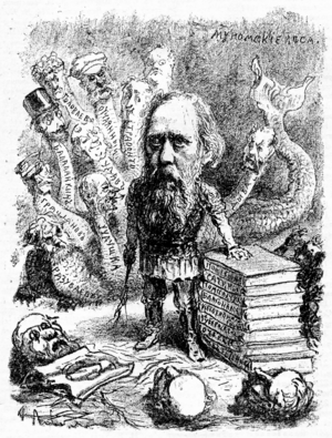 Шарж на Салтыкова-Щедрина с изображением Иудушки и Арины Петровны, Балалайкина («Современная идиллия»), Грацианова и Разуваева («Убежище Монрепо»), а также персонажей сатирических очерков. (الروسية)