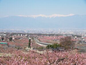 Kofu Basin Peach blossom and the Minami Alps.JPG