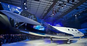 Virgin Galactic SpaceShipTwo "Unity" rollout 19Feb2016, FAITH hangar, Mojave, California.jpg