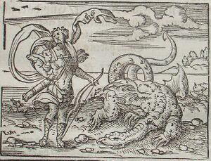 "Apol·lo matant a Pitó", gravat del 1581 fet per [[Virgil Solis]] per a les [[Metamorfosis]] d'[[Ovidi]]. (الكتالانية)