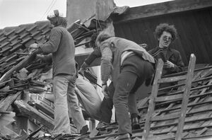 Workmen repairing storm-damaged roof in Utrecht (الإنجليزية)