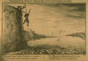 [[Polymnestor]] tue Polydore et jette son cadavre depuis une tour dans les flots se trouvant en contrebas, gravure de Bauer pour le livre XIII des ''[[Métamorphoses (Ovide)|Métamorphoses]]'' d'[[Ovide]], XVII<sup>e</sup> siècle. (الفرنسية)