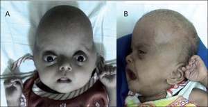Pfeiffer's syndrome type II with cloverleaf shaped skull and bilateral proptosis.png