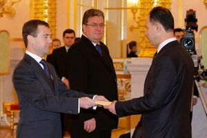 فائد مصطفى يقدم أوراق اعتماده إلى ديمتري ميدفيديف في 16 ديسمبر 2009 (العربية)