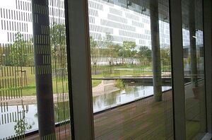 Teichanlage des Andreas-Pfitzmann-Baus, fotografiert aus dem Inneren des Gebäudes durch eine äußere Glaswand (الألمانية)