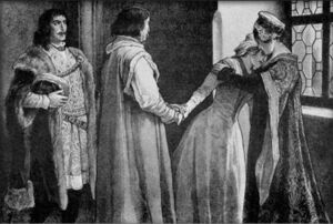 Catalina Podiebrad abandonando su hogar para viajar a Hungría. Obra de Věnceslav Černý (الإسبانية)