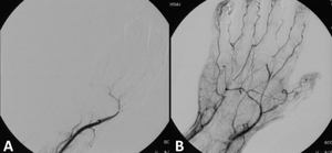 Angiograph before and after thrombolytic therapy in a case of thrombosis on the hand.png