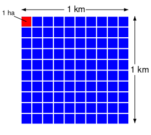 Un quilòmetre quadrat està compost per 100 hectàrees (ha) (الكتالانية)